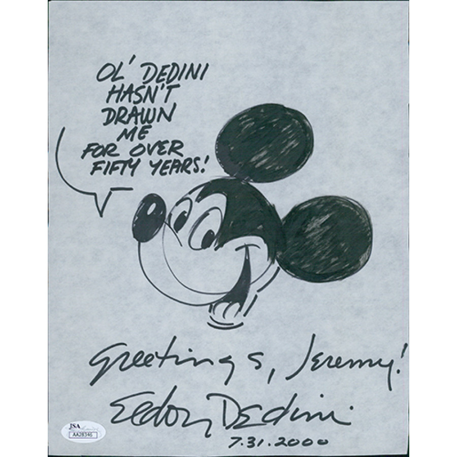 Signed Eldon Dedini 8x10 Page sketch of Mickey Mouse in black ink and personalized "Greeting, Jeremy!". The autograph has been certified by James Spence Authentication (JSA) with sticker affixed to item and matching card.