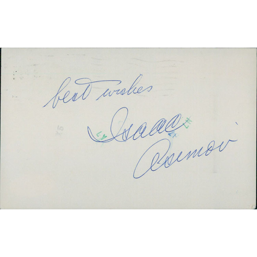 Signed Isaac Asimov 3.5x5.5 Postcard in blue pen. This item is certified by James Spence Authentication (JSA) with sticker affixed to item and matching card.