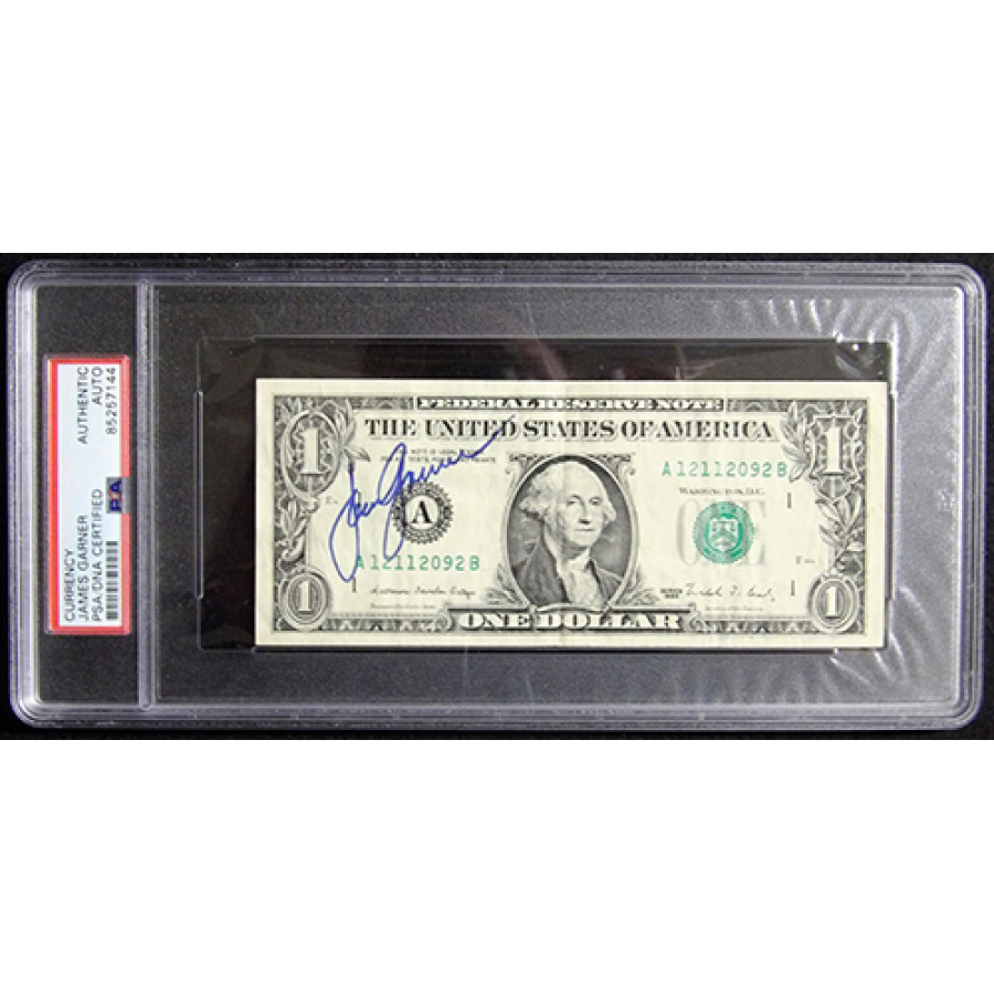 Signed James Garner one dollar bill in blue ink. This item has been certified by Professional Sports Authenticator (PSA) encapsulated.