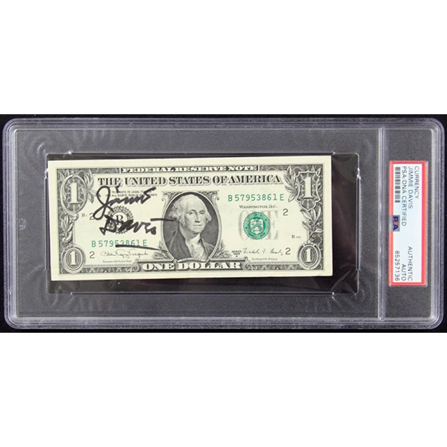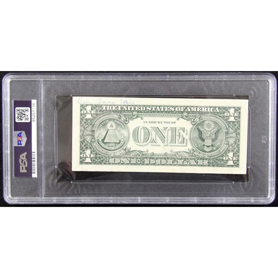 Signed Jimmie Davis one dollar bill in black sharpie. This item has been certified by Professional Sports Authenticator (PSA) encapsulated.