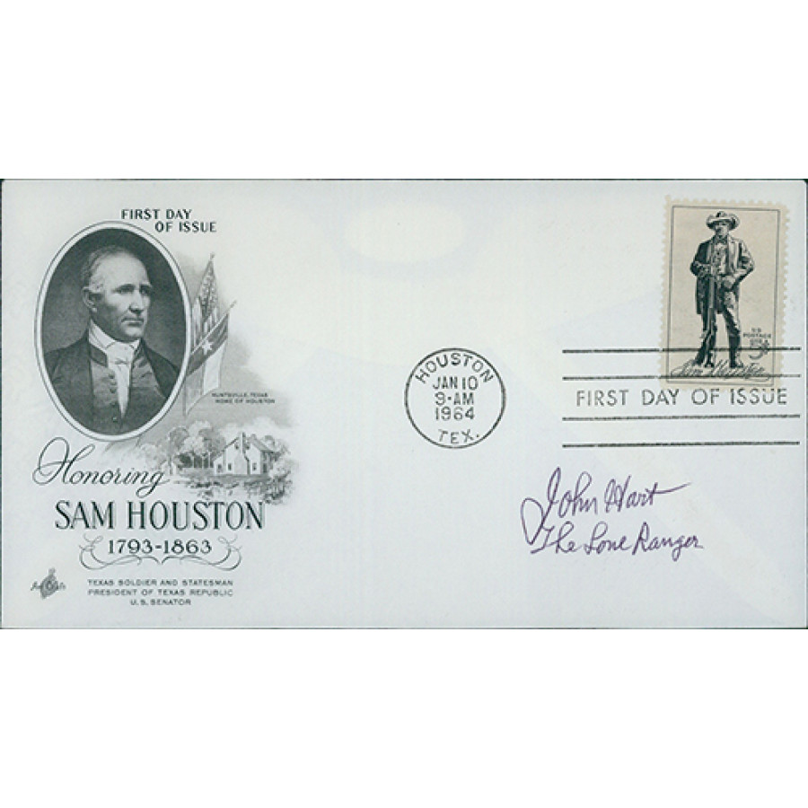 Signed John Hart Honoring Sam Houston First Day Issue Cover in black pen with "The Lone Ranger" inscription. This autograph has been certified by James Spence Authentication (JSA) with sticker on item and matching card.