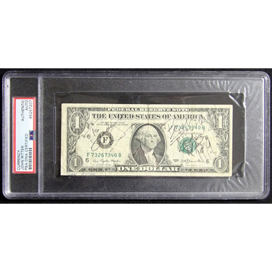 Signed John Ritter one dollar bill in black ink personalized. This item has been certified by Professional Sports Authenticator (PSA) encapsulated.