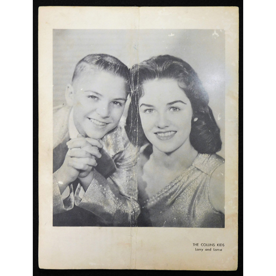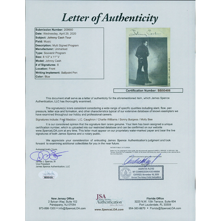 Signed Johnny Cash Souvenir Tour Program by 8 in blue ink on the cover. The signatures include Johnny Cash, Fred Maddox, J.C. Caughron, Charlie Williams, Sonny Burgess and Molly Bee. The program has fold marks vertically through the center of the entire program. This item has been certified by James Spence Authentication (JSA) with letter of authenticity.