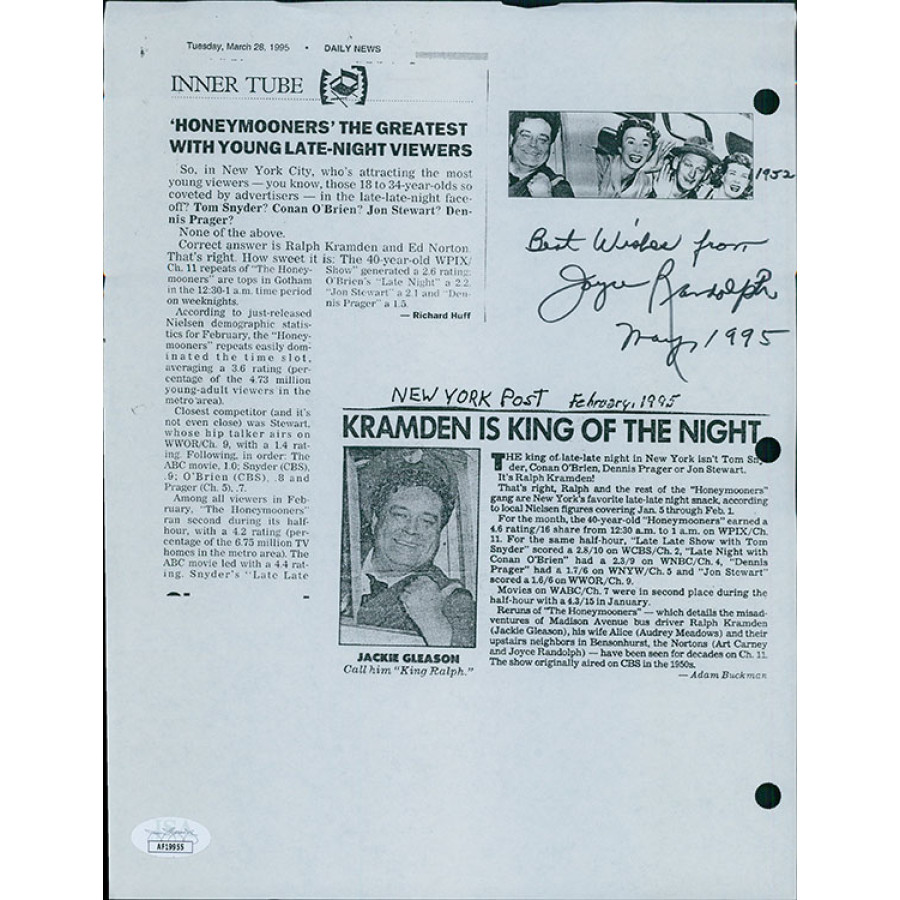 Signed Joyce Randolph 8.5x11 Daily News Photo Copy Page in black ink. There is a three hole punch in the right side of the page. This item has been certified by James Spence Authentication (JSA) with sticker affixed to item and matching card.