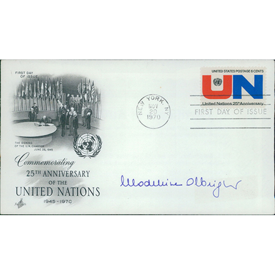 Signed Madeleine Albright Commemorating 25th Anniversary of the United Nations First Day Issue Cover in blue ink. This item has been certified by James Spence Authentication (JSA) with sticker on item and matching card.