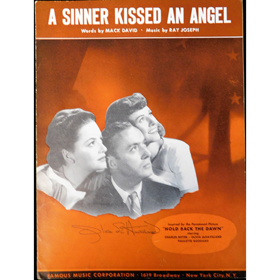 Signed Olivia deHavilland A Sinner Kissed An Angel sheet music in black ink. This item has been authenticated by James Spence Authentication (JSA) with sticker affixed to item and matching card. This item is in used condition with minor wear and tear.