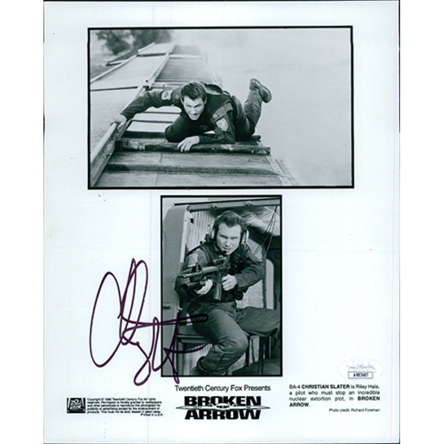 Signed Christian Slater Broken Arrow 8x10 matte finish photo in black sharpie. This item has been certified by James Spence Authentication (JSA) with sticker affixed to item and matching card.