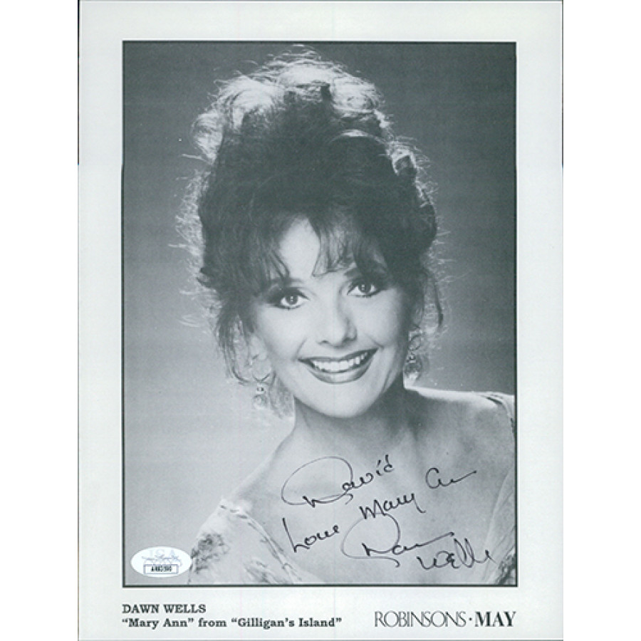 Signed Dawn Wells Gilligan's Island 8x10 cardstock promo photo in black ink personalized "David". This item has been certified by James Spence Authentication (JSA) with sticker affixed to item and matching card.