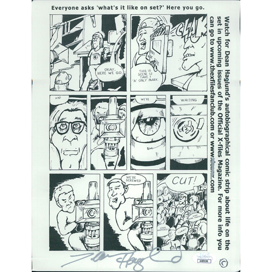 Signed Dean Haglund 8.5x11 cardstock promo in silver ink. This item has been certified by James Spence Authentication (JSA) with sticker affixed to item and matching card.