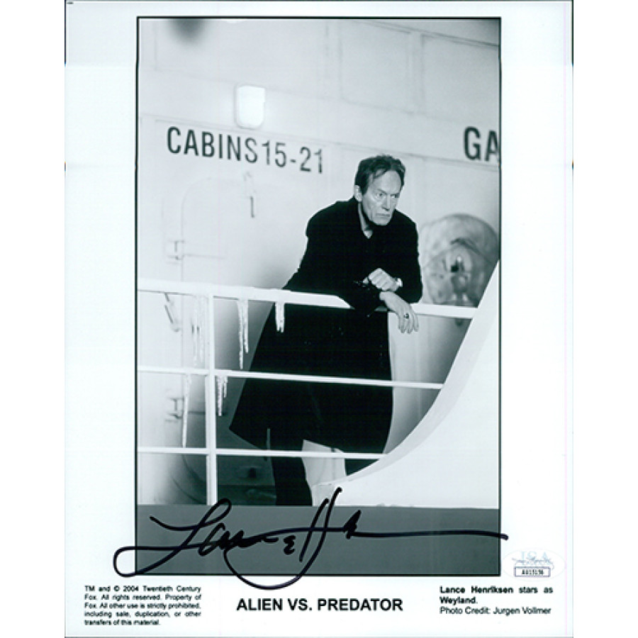 Signed Lance Henriksen Alien Vs. Predator 8x10 glossy finish promo photo in black sharpie. This item has been certified by James Spence Authentication (JSA) with sticker affixed to item and matching card.
