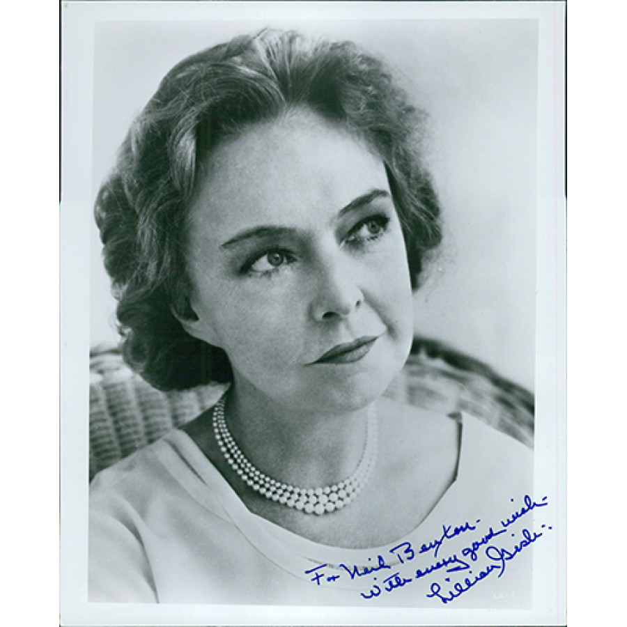 Signed Lillian Gish 8x10 Original Still Glossy photo in blue ink personalized "For Neil Benton". The autograph has been certified by James Spence Authentication (JSA) with sticker affixed to item and matching card.