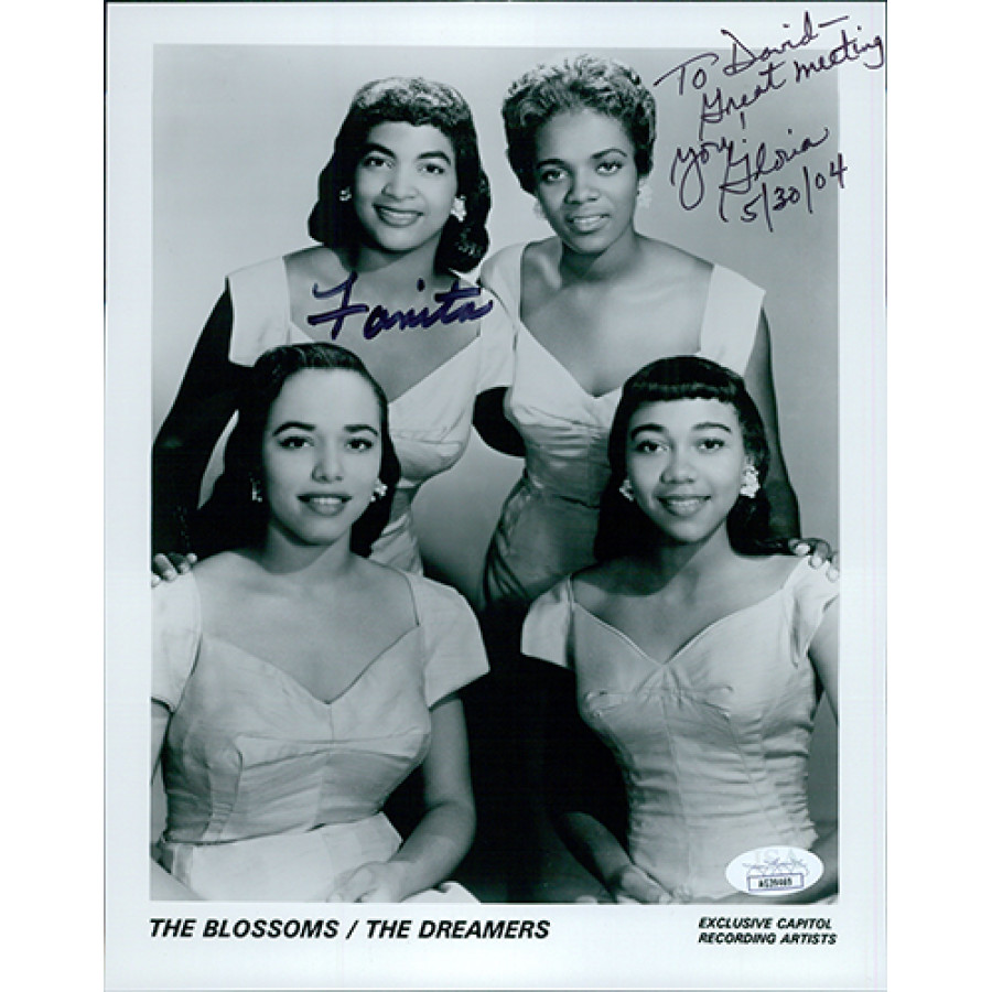 Signed The Blossoms / The Dreamers Fanita James and Gloria Jones 8x10 glossy finish promo photo in black ink by both. This item has been certified by James Spence Authentication (JSA) with sticker on item and matching card.