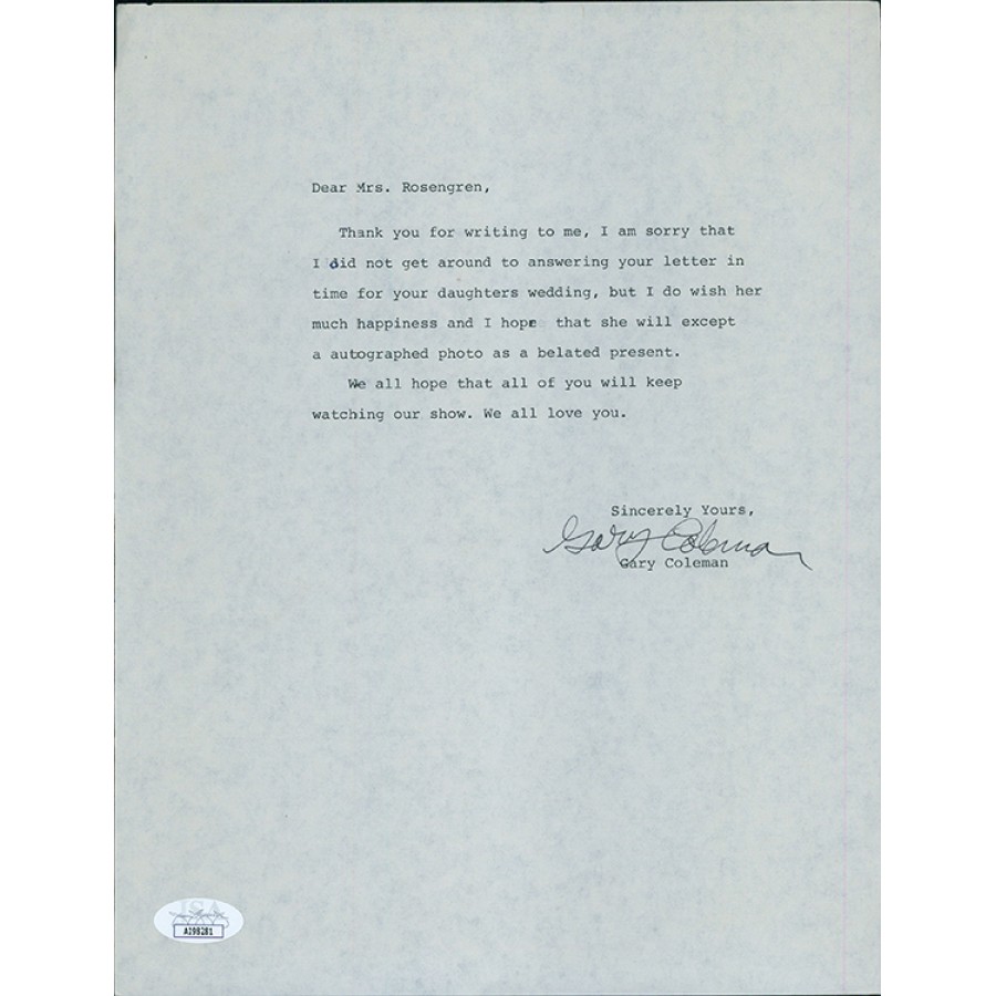 Signed Gary Coleman 8.5x11 typed reply letter in black ink. This item has been certified by James Spence Authentication (JSA) with sticker on item and matching card.