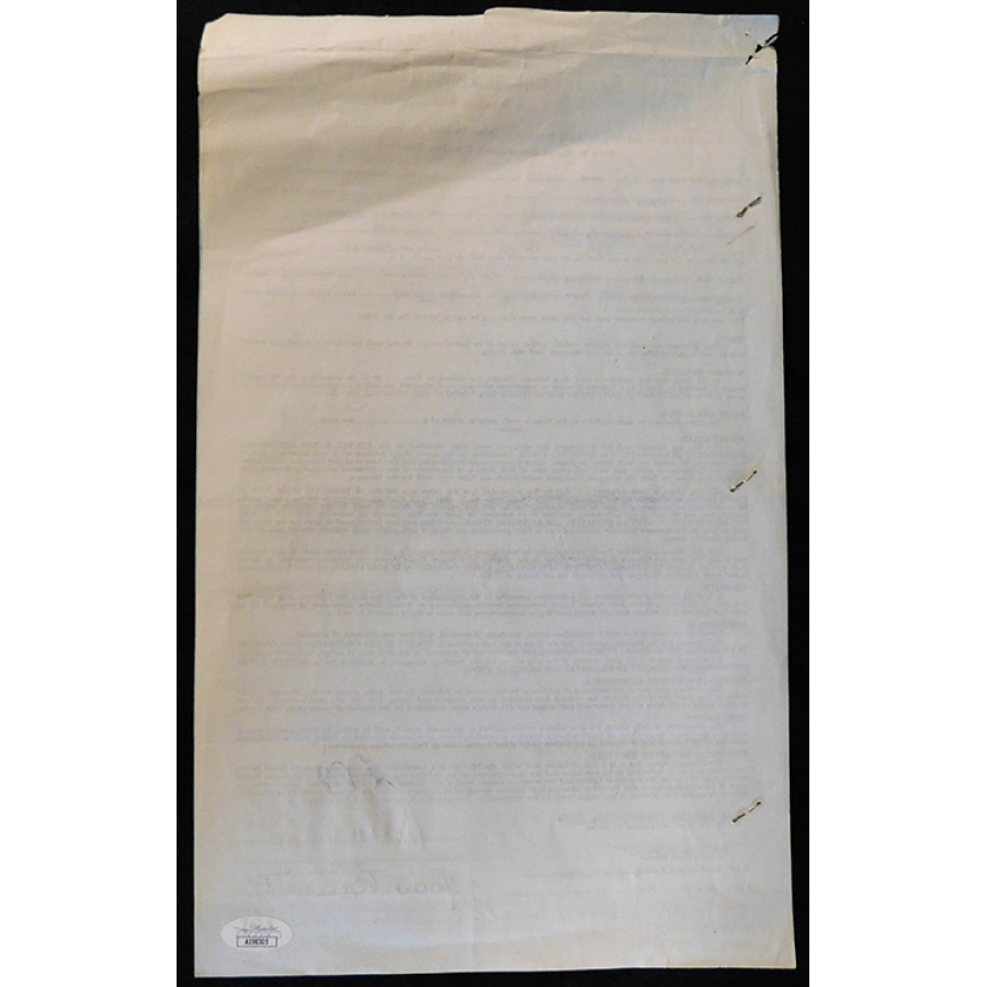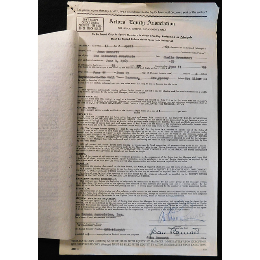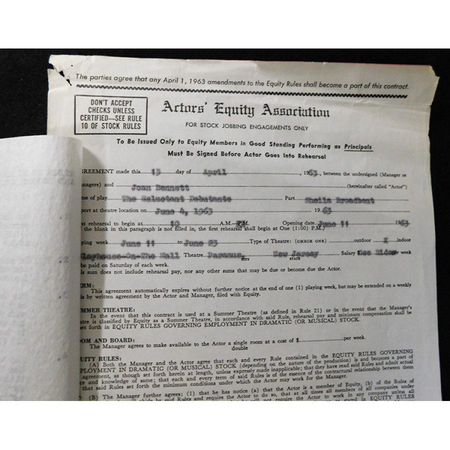 Signed Joan Bennett The Reluctant Debutante Play Contract dated 4/13/63 in black ink. The contract has staples, some rips and creases. The item measures 8.5x14 inches. This item is certified by James Spence Authentication (JSA) with sticker affixed to item and matching card.