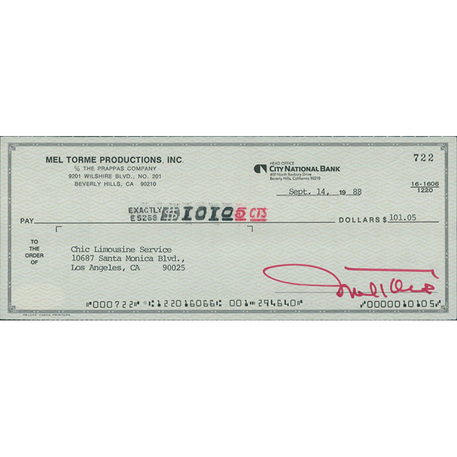 Signed Mel Torme cancelled check made out to Chic Limousine Service. This item has been certified James Spence Authentication with sticker affixed to item and matching card.