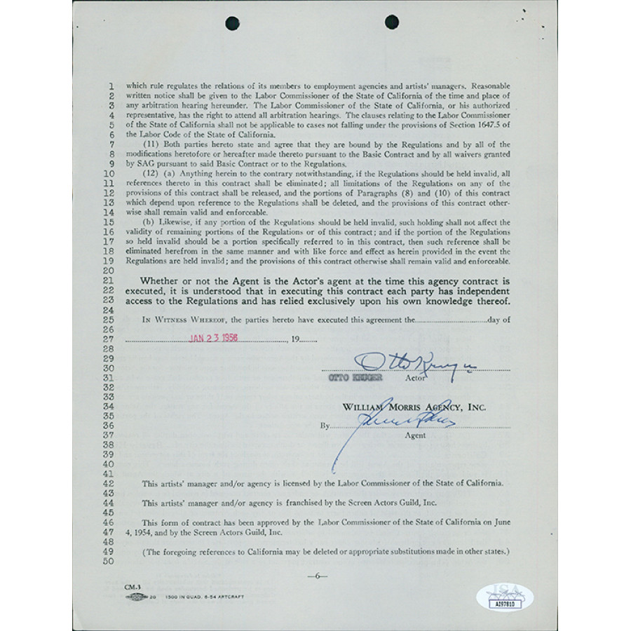Signed Otto Kruger contract from William Morris Agency dated Jan. 23, 1956. The contract does have some staple marks in the top right corner and some light wearing. The contract measures 8.5x11 inches and is three double sided pages. This item is certified by James Spence Authentication (JSA) with sticker affixed to item and matching card.