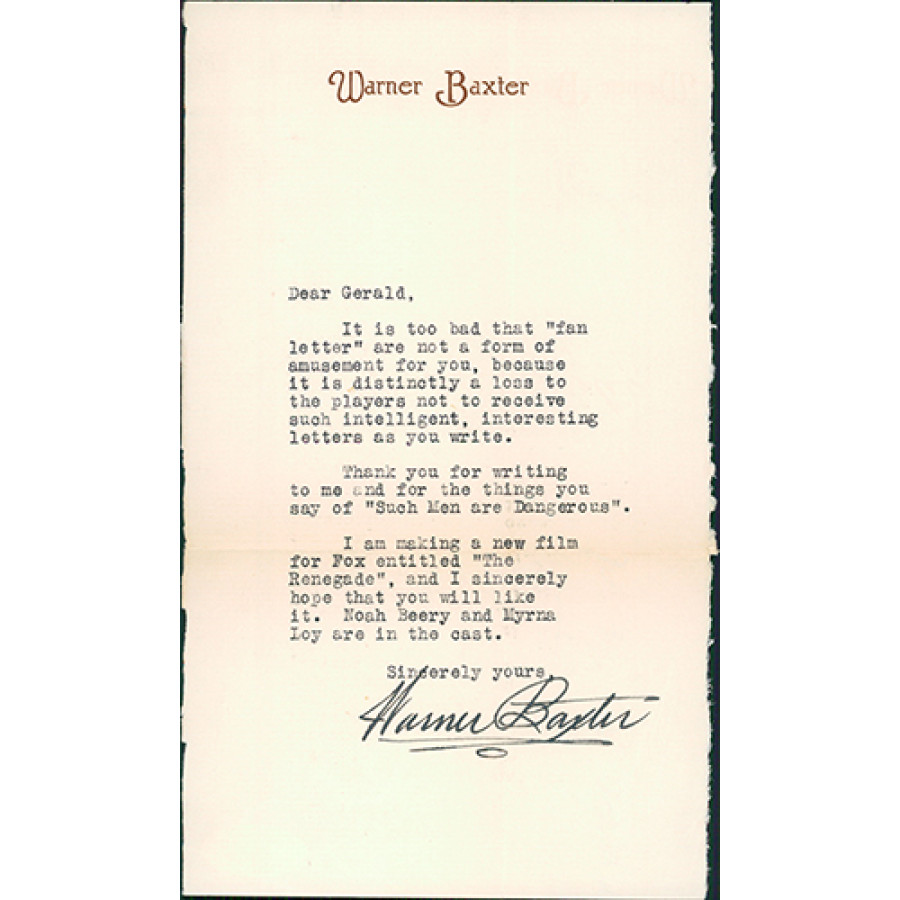 Signed Warner Baxter Typed Letter Response in black ink. This item has been certified by James Spence Authentication (JSA) with sticker affixed to item and matching card.