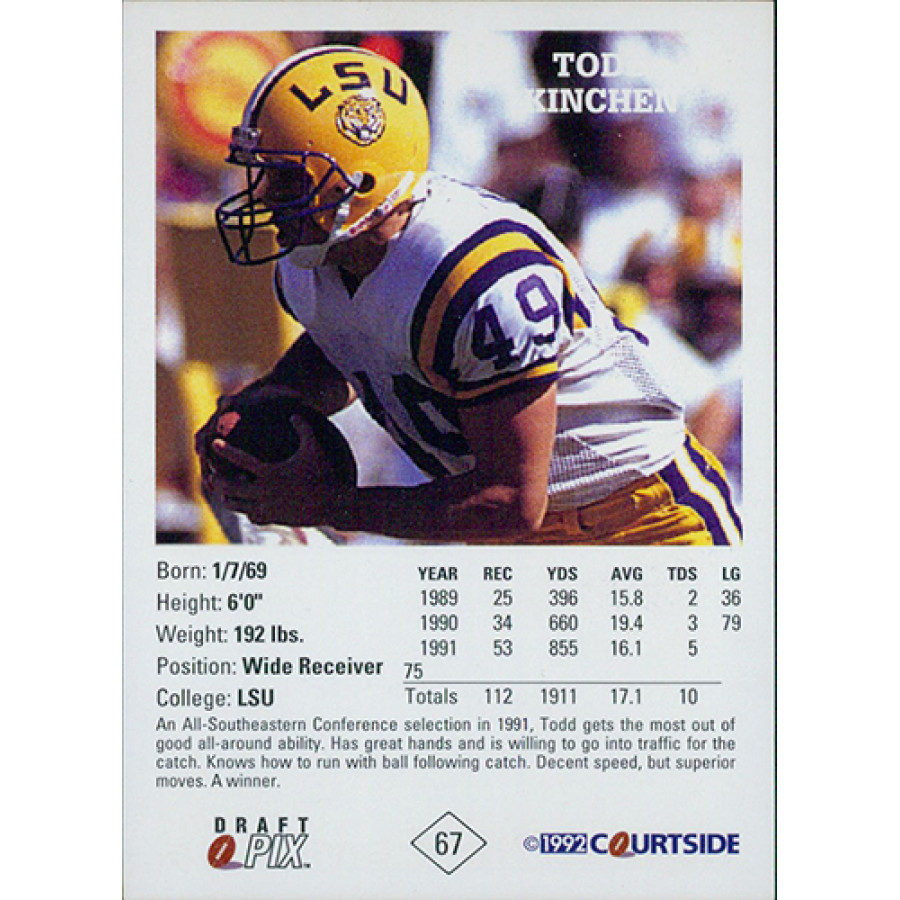 Todd Kinchen LSU Tigers 1992 Courtside Draft Pix Autographed Football Card #67.