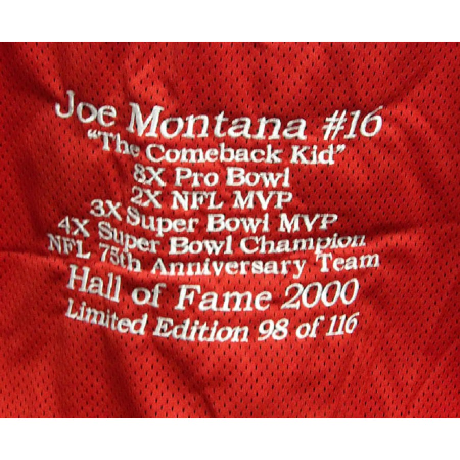 Signed Joe Montana San Francisco 49ers custom limited edition 98/116 jersey in black sharpie on the back number. This item is certified by James Spence Authentication (JSA) with sticker affixed to item and matching card.