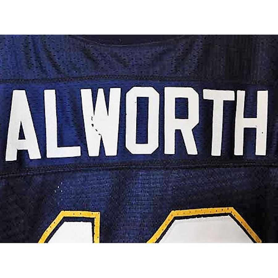 Signed Lance Alworth San Diego Chargers Authentic Jersey size 44 in black sharpie. This comes certified by James Spence Authentication (JSA) with sticker attached to item and matching card. The numbers are stitched on over the original numbers that were heated on the jersey. It looks like it wasn't a perfect overlay as in some places you can see it the difference. The Jersey is in very good condition with the exception of the name it does have some of the white that came off the back lettering.
