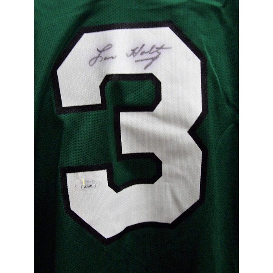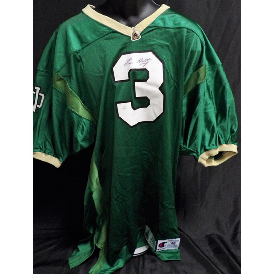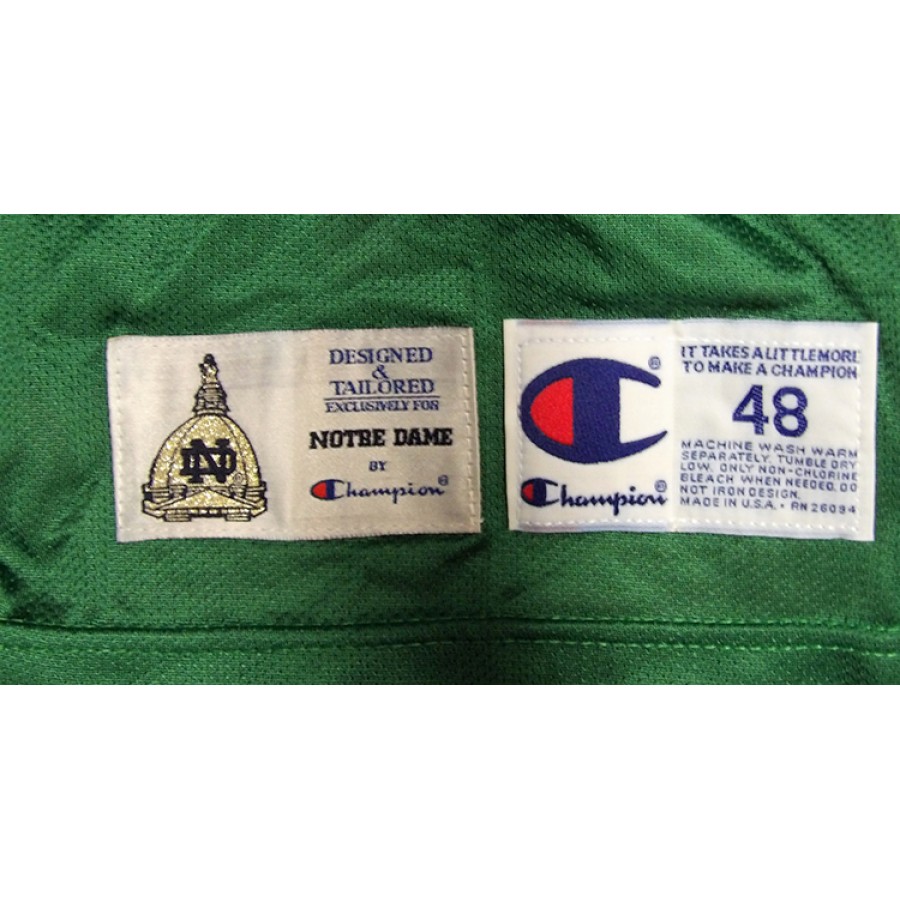 Signed Lou Holtz Notre Dame Fighting Irish Authentic Champion Jersey size 48 in black sharpie on the front number. There is bleeding/fading of the signature. This item is certified by James Spence Authentication (JSA) with sticker affixed to item and matching card.