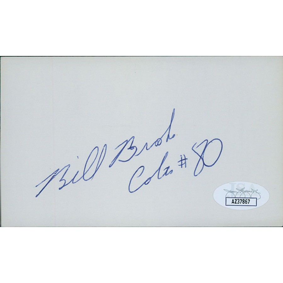 Signed Bill Brooks 3x5 index card in blue ink. This item has been certified by James Spence Authentication (JSA) with sticker affixed to item and matching card.