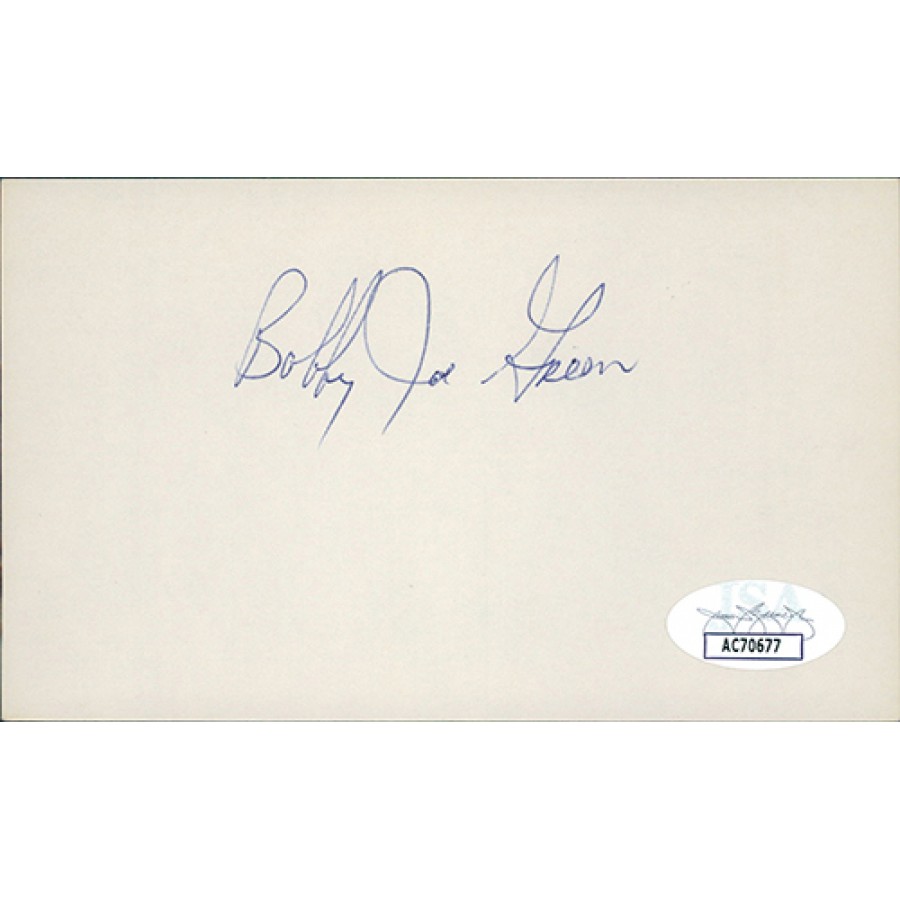Signed Bobby Joe Green 3x5 Index Card in blue ink. This item has been certified by James Spence Authentication (JSA) with sticker on item and matching card.