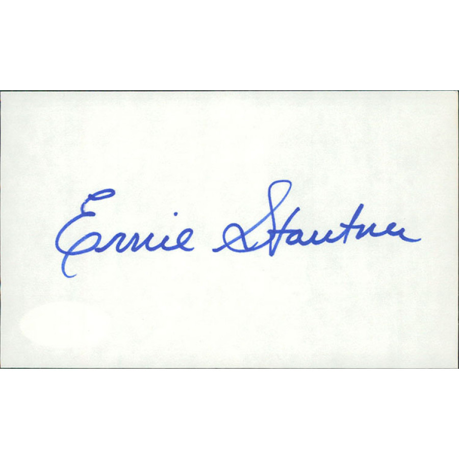 Signed Ernie Stautner 3x5 Index Card in blue sharpie. This item has been certified by James Spence Authentication (JSA) with sticker on item and matching card.
