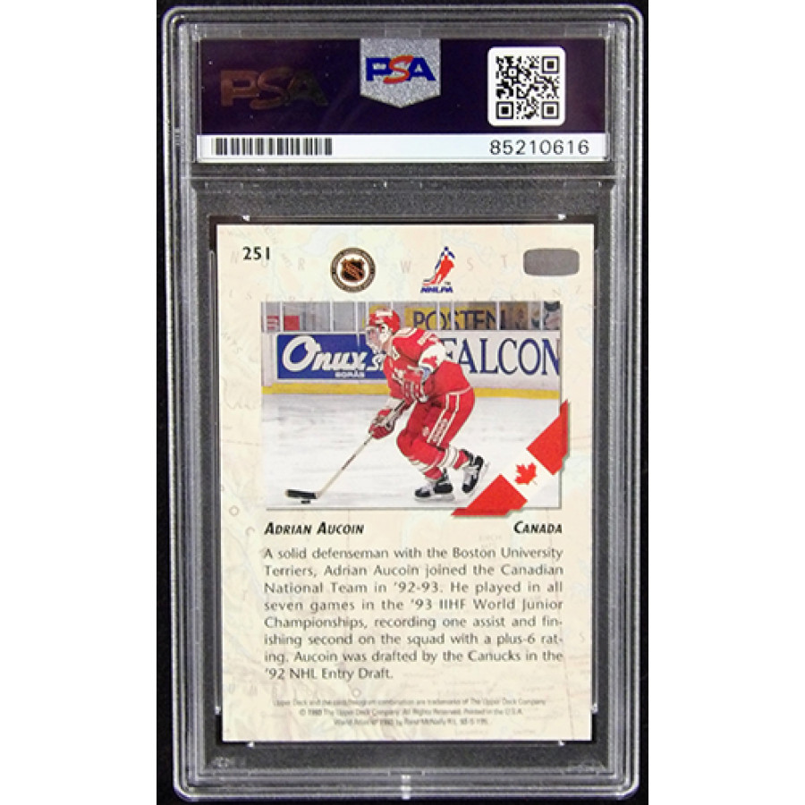 Signed Adrian Aucoin 1993-94 Upper Deck hockey card #251 in gold ink. This item is certified by Professional Sports Authenticators (PSA) encapsulated.