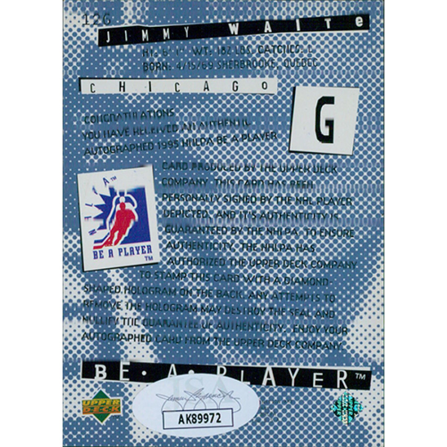Signed Jimmy Waite 1994-95 Upper Deck Be A Player Hockey Card #126. This item has been certified by James Spence Authentication (JSA) with sticker affixed to item and matching card.