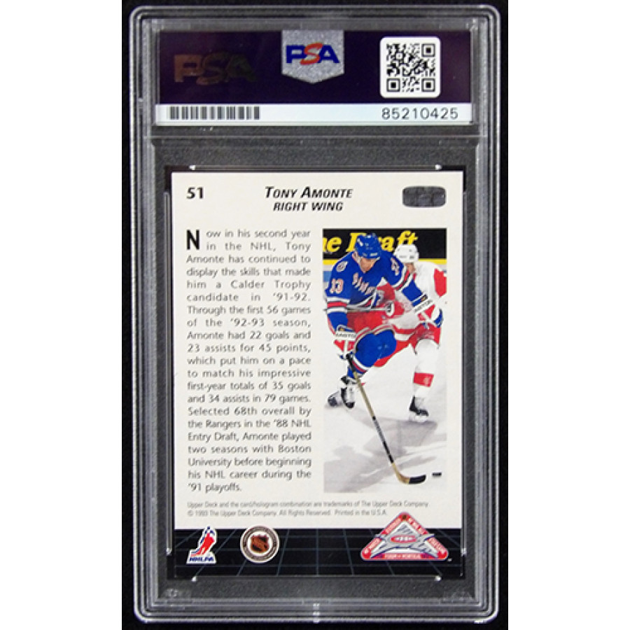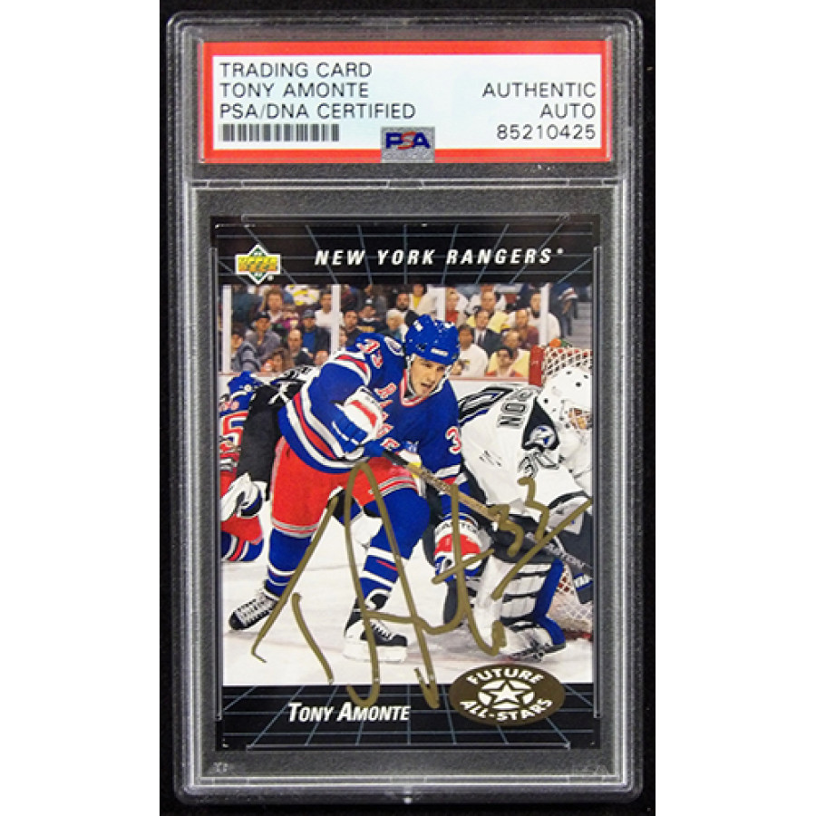 Signed Tony Amonte New York Rangers 1992-93 Upper Deck Locker Series hockey card #51 in gold ink. This item is certified by Professional Sports Authenticators (PSA) encapsulated.