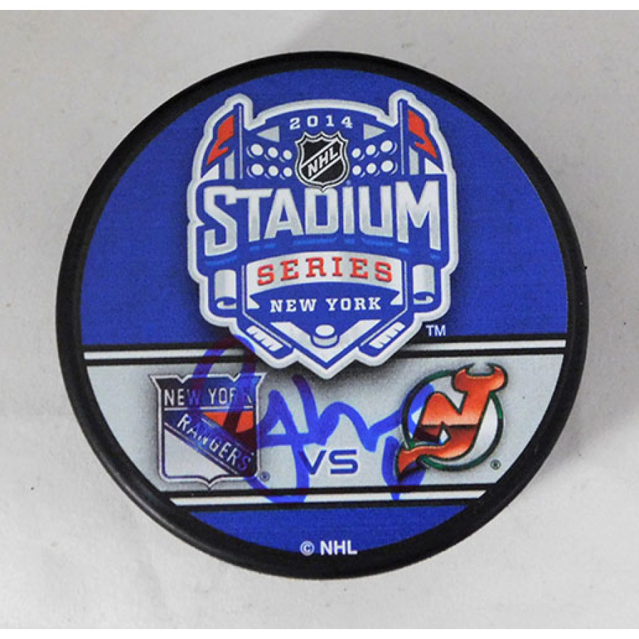 Signed Andy Greene New Jersey Devils 2014 Stadium Series Hockey Puck in blue sharpie. This item has been certified by James Spence Authentication (JSA) with sticker affixed to item and matching card.