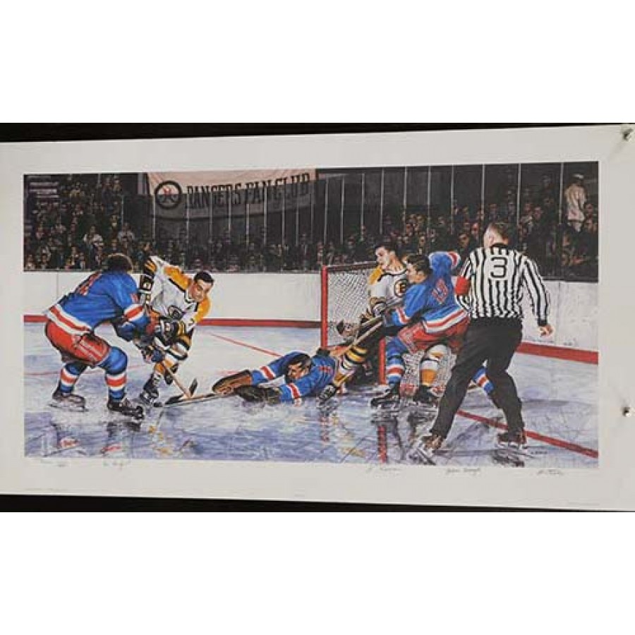 In The Slot Vic Hadfield, Ed Giacomin & John Bucyk Signed Lithograph JSA Authen