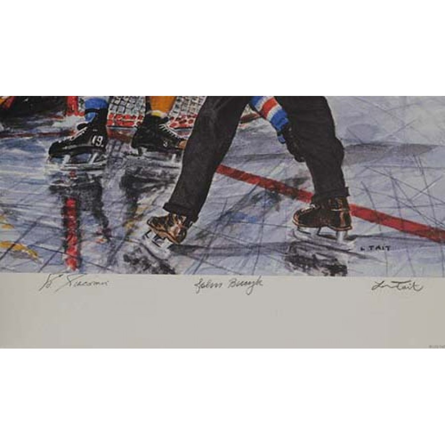 Signed In The Slot Lithograph by Vic Hadfield, Ed Giacomin and John Bucyk in pencil. It is also signed by the artist. This is individually numbered to 2,000. The Lithograph measures about 33x18.75 inches. There are some light creases and corner creases in the litho. This item is certified by James Spence Authentication (JSA) with sticker affixed to item and matching card.