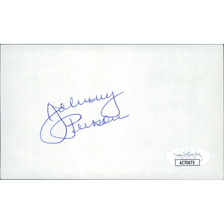 Signed Johnny Peirson 3x5 Index Card in blue ink. This item has been certified by James Spence Authentication (JSA) with sticker affixed to item and matching card.