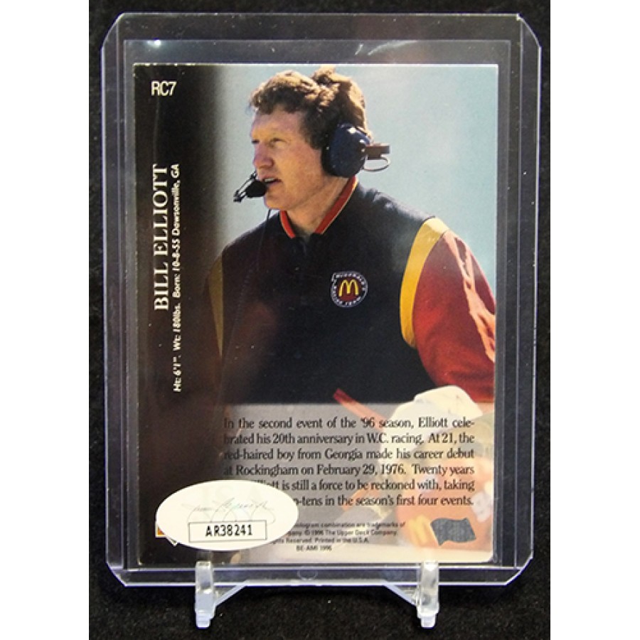 Signed Bill Elliott 1996 Upper Deck Road To The Cup Racing Card #RC7 in black sharpie. This item is certified by James Spence Authentication (JSA) with sticker affixed to the item and matching card. This item is in good condition with some signs of wearing.