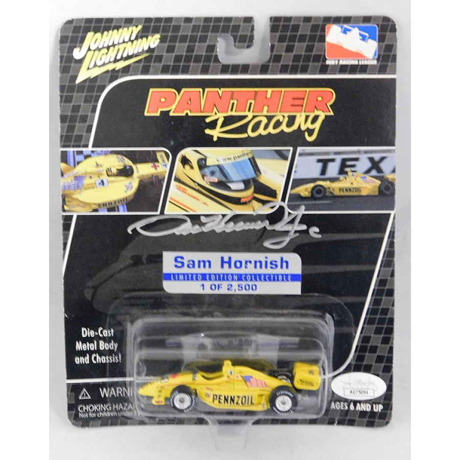 Signed Sam Hornish Jr. Johnny Lightning Die-Cast Indycar Pennzoil in silver sharpie on the cardstock. The packaging has some wearing with light creases and shelf wear. This item is certified by James Spence Authentication (JSA) with sticker affixed to item and matching card.