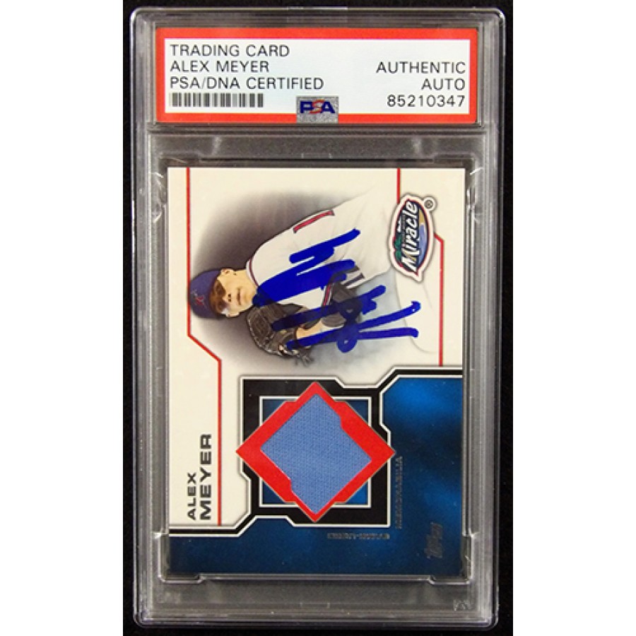 Signed Alex Meyer 2013 Topps Pro Debut Minor League Materials relic baseball card #MLM-AME in blue sharpie. This item is certified by Professional Sports Authenticators (PSA) encapsulated