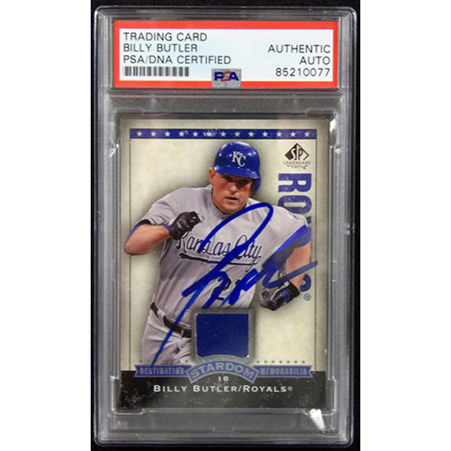 Signed Billy Butler Kansas City Royals 2008 Upper Deck SP Legendary Cuts Destination Stardom Memorabilia baseball card #DS-BB in blue sharpie. This item is certified by Professional Sports Authenticators (PSA) encapsulated.