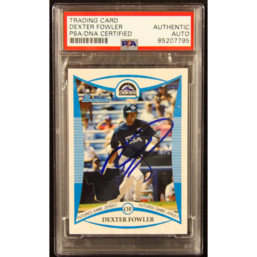 Signed Dexter Fowler Colorado Rockies 2006 Bowman Draft Picks and Prospects relic baseball card #BDPP75 in blue sharpie. This item is certified by Professional Sports Authenticator (PSA) encapsulated.