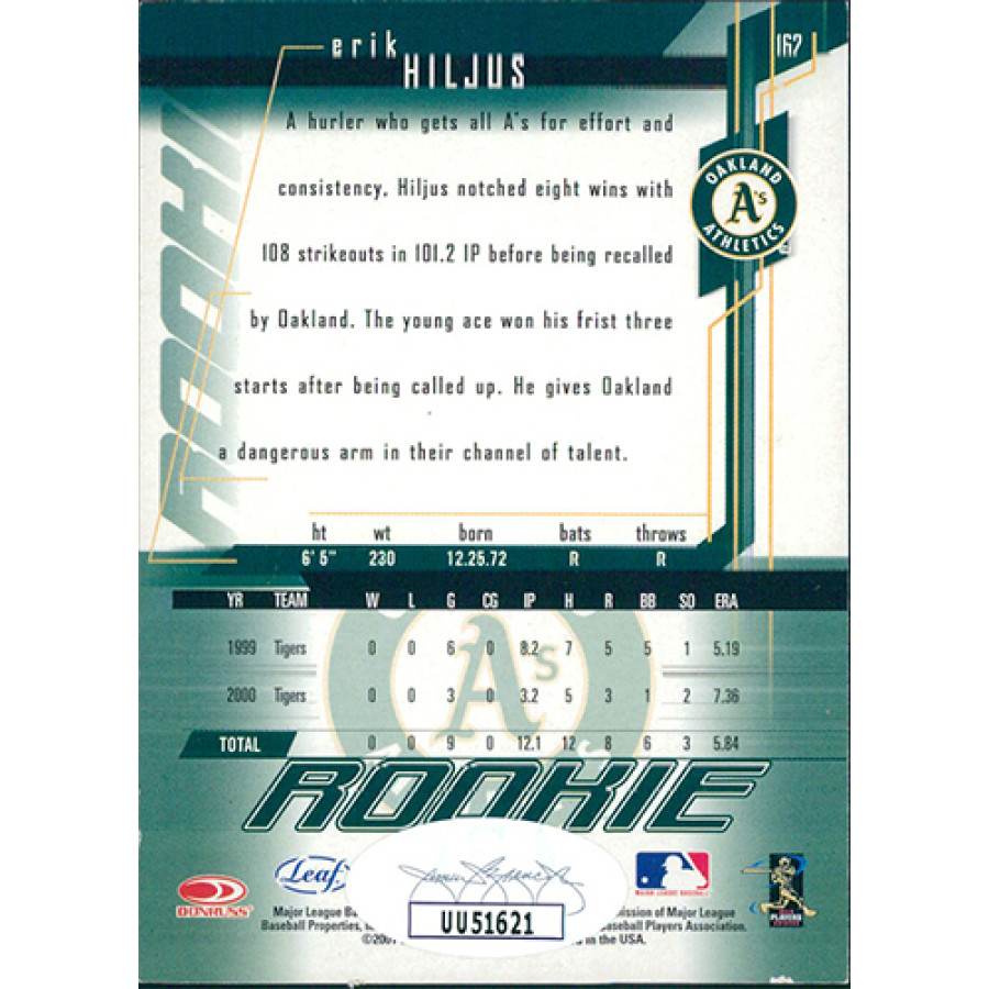 Signed Erik Hiljus Oakland Athletics 2001 Leaf Rookies and Stars Baseball Card #162 in black sharpie. This item is certified by James Spence Authentication (JSA) with sticker affixed to item and matching card.