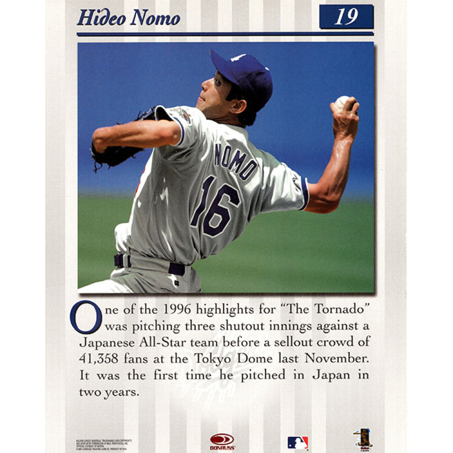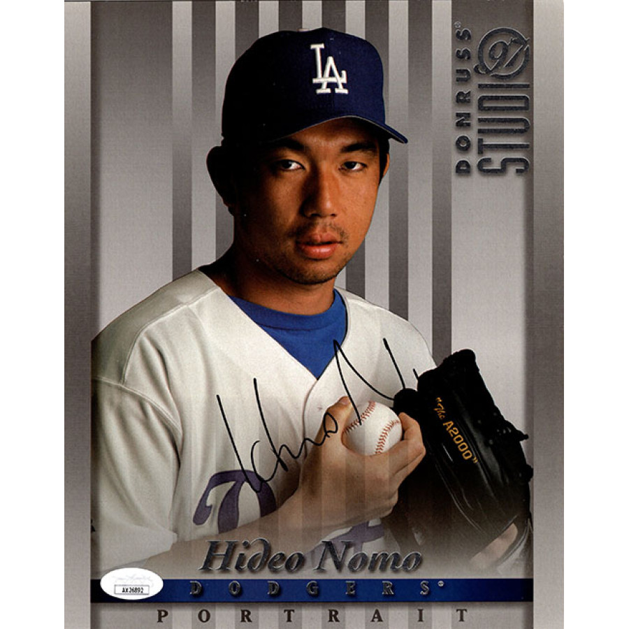 Signed Hideo Nomo Los Angeles Dodgers 1997 Donruss Studio Portrait 8x10 jumbo baseball card #16 in black ink. This item is certified by James Spence Authentication (JSA) with sticker affixed to item and matching card.