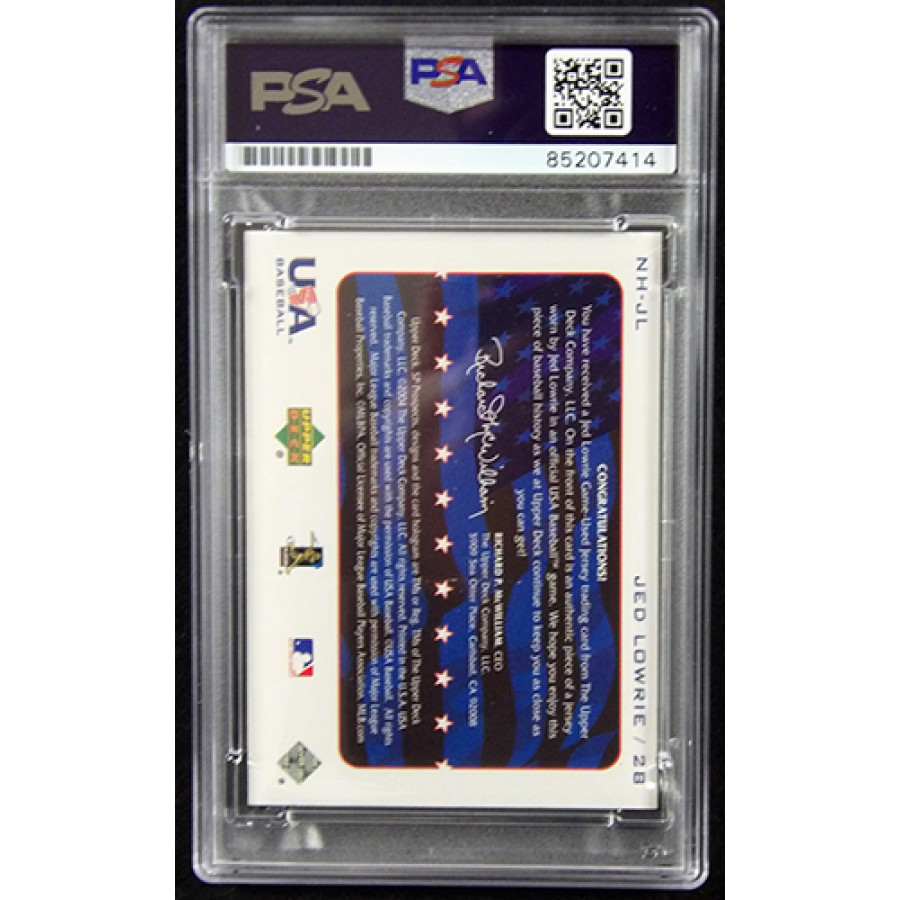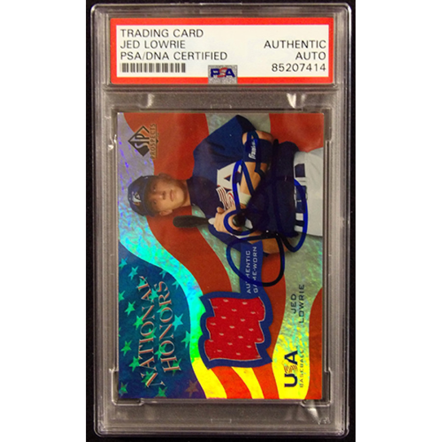 Signed Jed Lowrie 2004 Upper Deck SP Prospects USA Baseball Nationals Honors relic baseball card #NH-JL in blue sharpie. This item is certified by Professional Sports Authenticators (PSA) encapsulated.