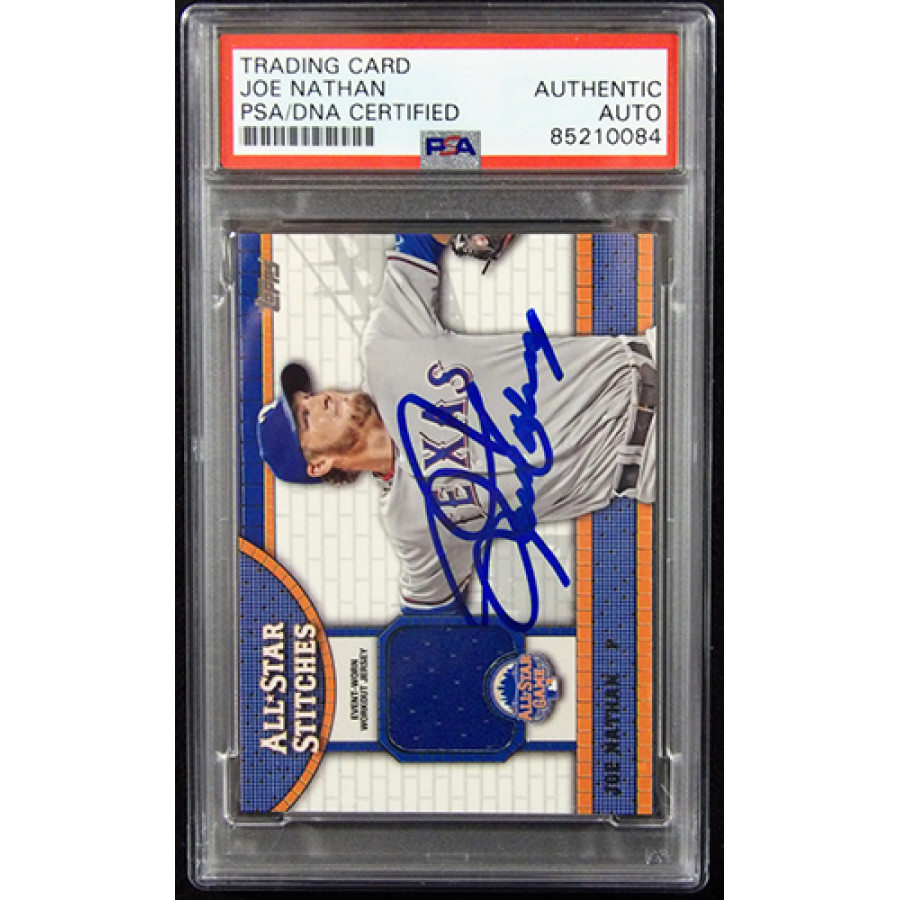 Signed Joe Nathan 2013 Topps All-Star Stitches relic baseball card #ASR-JN in blue sharpie. This item is certified by Professional Sports Authenticators (PSA) encapsulated.