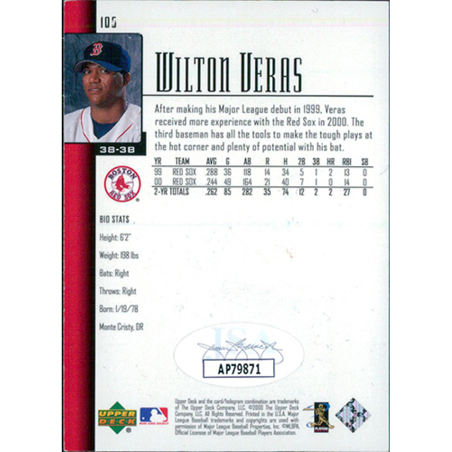 Signed Wilton Veras Boston Red Sox 2000 Upper Deck baseball card #105 in blue ink. The card has some wearing with scratches and light stains. This item is certified by James Spence Authentication (JSA) with sticker affixed to item and matching card.
