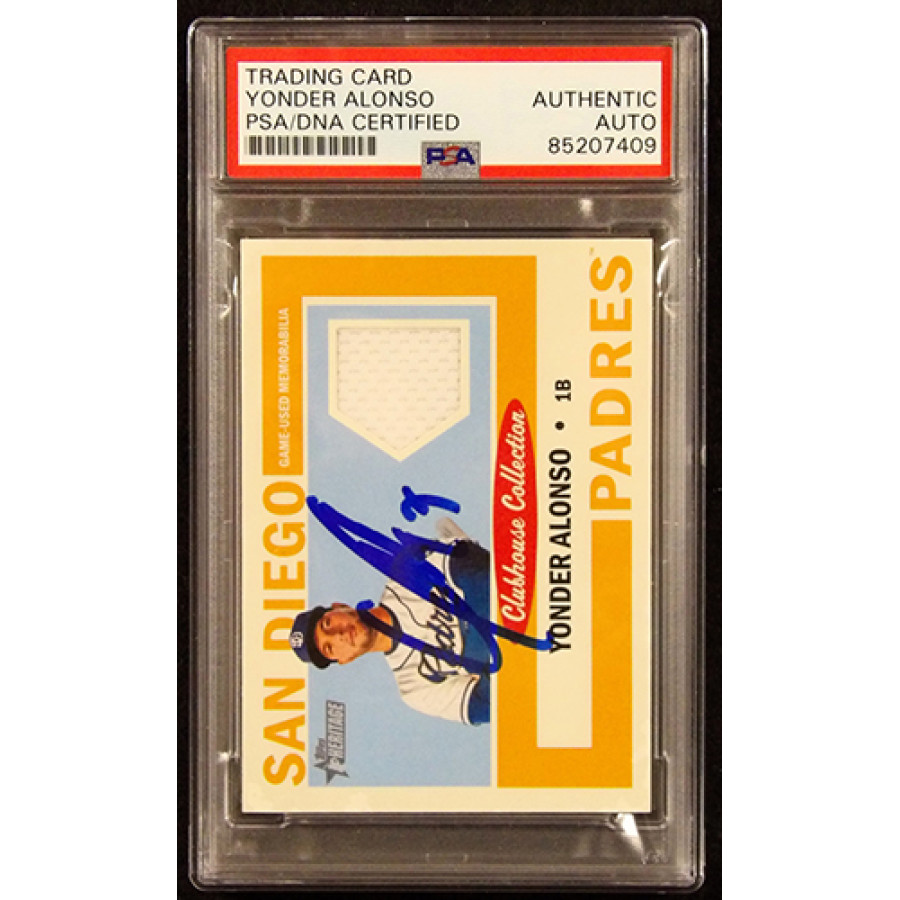 Signed Yonder Alonso San Diego Padres 2013 Topps Heritage Clubhouse Collection Relic baseball card #CCR-YA in blue sharpie. This item is certified by Professional Sports Authenticators (PSA) encapsulated.