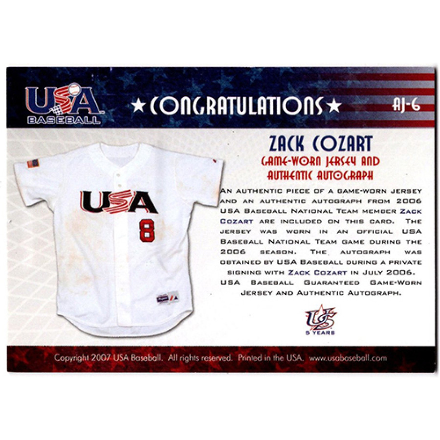 Signed Zack Cozart 2007 USA Baseball National Jersey and Signature baseball card #AJ-6. This is numbered 96 of 295.