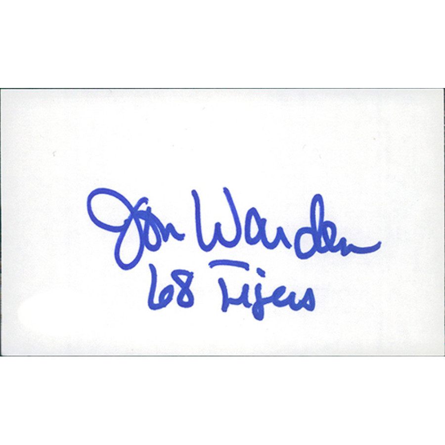 Signed Jon Warden 3x5 Index Card in blue sharpie with "68 Tigers" inscription. This autograph has been certified by James Spence Authentication (JSA) with sticker on item and matching card.