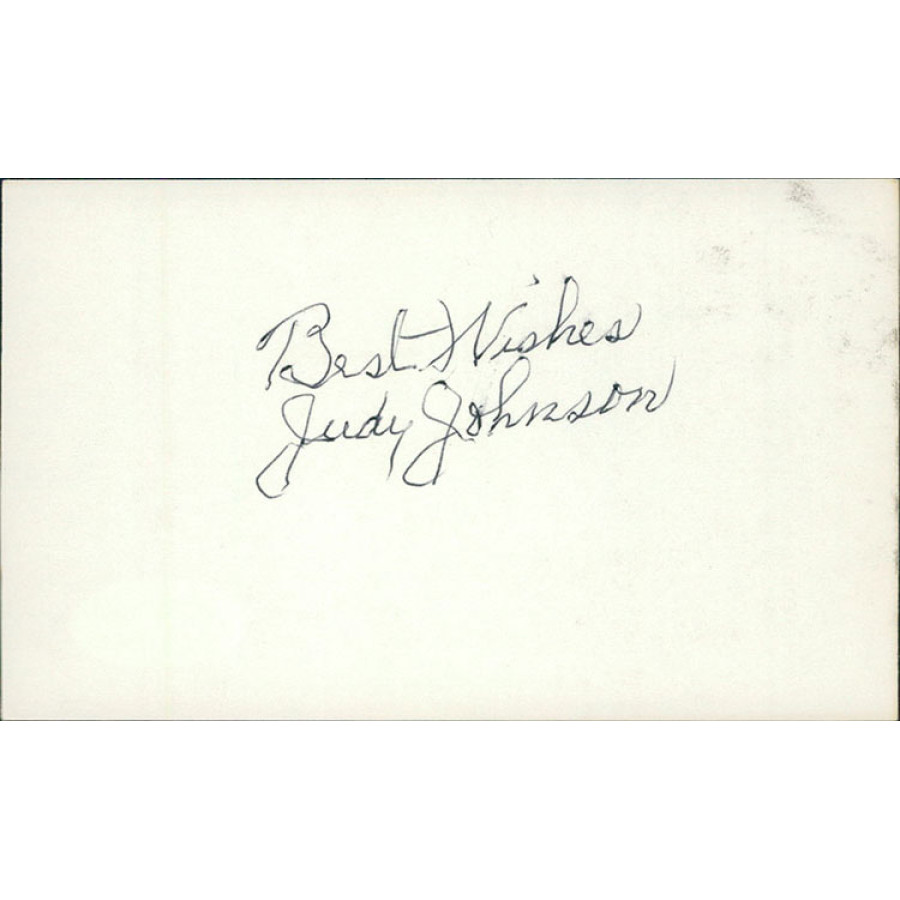 Signed Judy Johnson 3x5 Index Card in black pen. This item has been certified by James Spence Authentication (JSA) with sticker affixed to item and matching card.