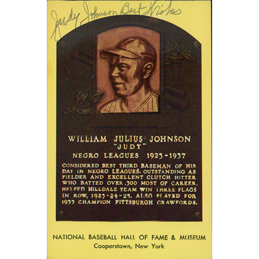 Signed Judy Johnson Yellow Hall of Fame plaque postcard in black ink. This item has been certified by James Spence Authentication (JSA) and will come with a sticker on the item and matching card.